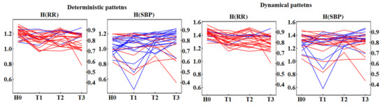 Traces of ShE obtained from 27 signals with RR-intervals and SBP recorded in each time window H0, T1, T2, and T3. The red colour is used for signals for which entropy in H0 is greater than in T3. The blue colour marks signals for which the opposite relation is observed. Friedman one-way repeated measures ANOVA on ranks provides: deterministic patterns—RR-intervals indicate statistically significant differences in the group medians (); the pairwise comparisons (Tukey test) of the groups show that H0 is different from both groups T1 and T3. SBP values indicate statistically significant differences in medians among the groups (), but the pairwise comparison (Tukey test) does not show any pair to be significantly different; dynamical patterns—RR-intervals exhibit statistically significant differences in medians (); the pairwise comparisons (Tukey test) show the H0 group to be different from the groups T1, and T3; SBP does not reach statistical significance for differences in medians ().