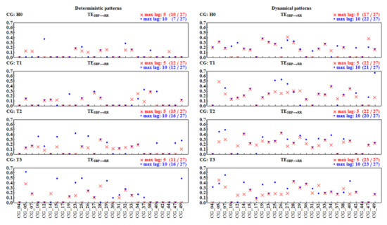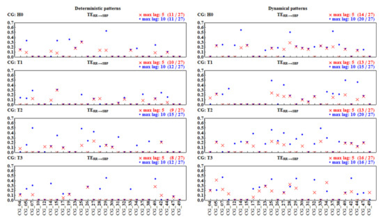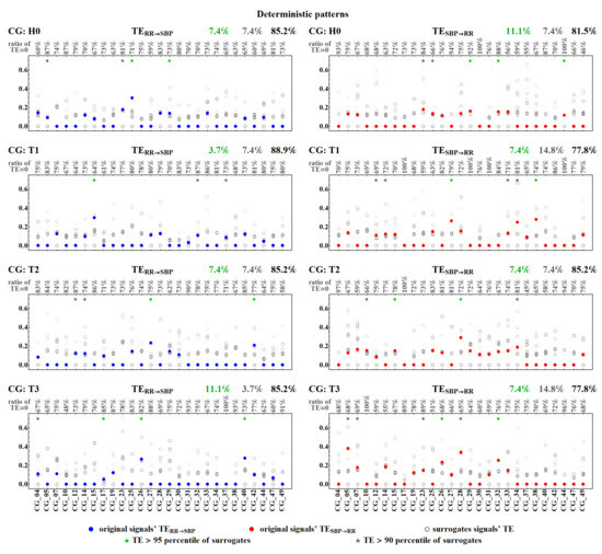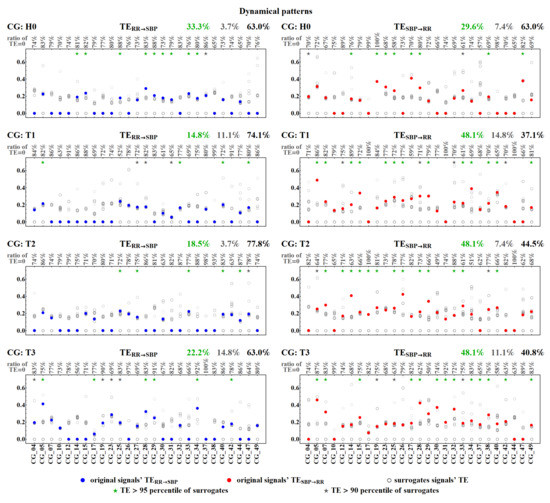 Among pairs of signals not adjusted in time, hence independent, approximately 70% led to zero TE. Hence, the estimates do not provide statistically significant values. In the set of the remaining non-zero results, one can investigate the relation between TE values obtained for the surrogate signals and the value of the TE provided by the unperturbed real signals. One can observe that only a few non-zero TE results survived random shifting, i.e., TE estimated for the original signals gave values statistically different (p < 0.05) from TE obtained for the shifted data. These statistically significant results are marked with green stars in Figure 13 and Figure 14. Their ratio with respect to the total number of signals considered is displayed in green above each plot. In general, these numbers are far from our expectations. Only in the case of the dynamic pattern representation, after the tilt, about half of the original signals provided non-zero , in contrast to the surrogate signals. Thus, we can hypothesize that, after the tilt, dynamical patterns could be considered to be satisfactorily sensitive detectors of the factual influence of SBP values on RR-intervals.