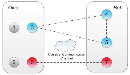 Comparing these two schemes, the main difference is the formulation of , which is closely related with the Bell-state measurement results sent from Alice. The original four cbits information is sent to Bob directly through classical communication channel. However, after observing Equation (15), we get the conclusion that whether the Z operation on particle 7 is required or not is determined by the XOR result between and . Thus, we use to denote the XOR result and the Equation (15) can be rewritten as