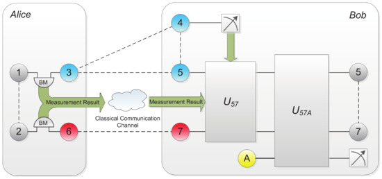 Bob then measures particle 4. If the result is , the teleportation fails. Otherwise, he continues to apply unitary operation on particles (5, 7) according to Equation (9). After that, Bob introduces an auxiliary particle A with its initial state and the system state changes into