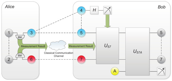 The main difference of this scheme is that Bob needs to send particle 4 through additional Hadamard gate () before measurement as shown in Figure 3. Afterwards, Bob performs projective measurement on particle 4. The unitary operation performed on particles (5, 7) to retrieve the correspondence would be determined by the measurement result together with through the following formula: