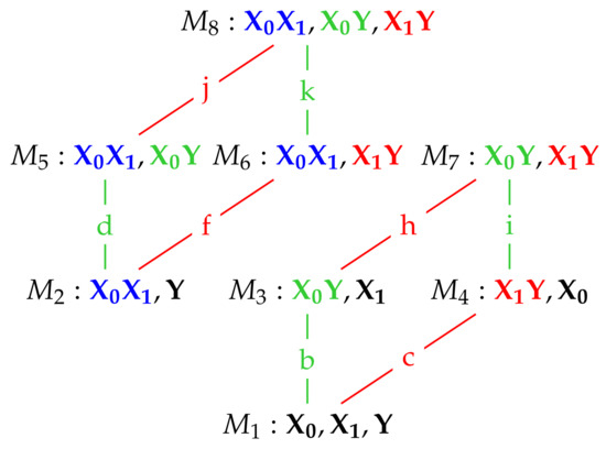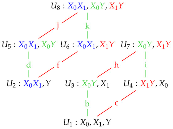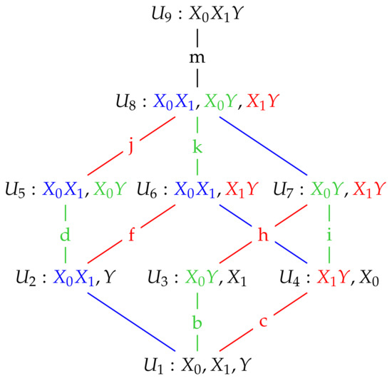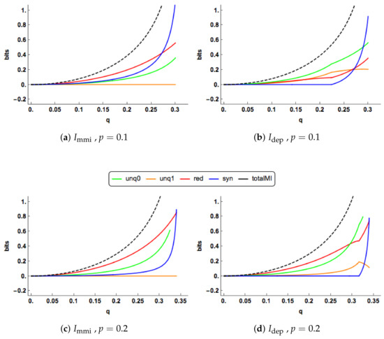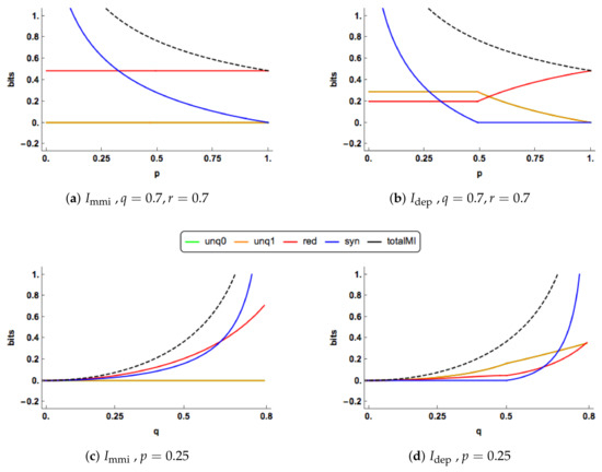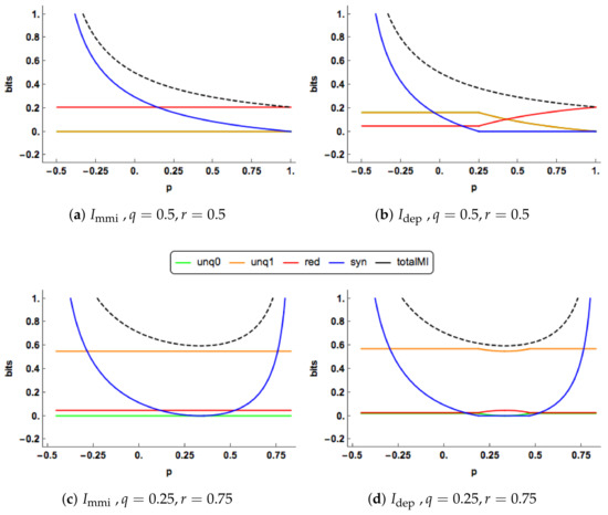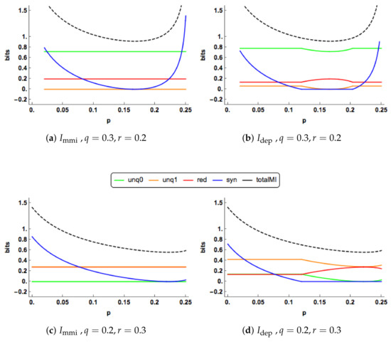 At , the synergy “switches off” in the PID, and stays “off” for larger values of p, and then the unique and redundancy components are free to change. In the range the redundancy increases and takes up all the mutual information when , while the unique informations decrease towards zero. The and profiles show different features in this case. The “regime switching” in the PID is interesting. As mentioned in Proposition 2, the minimum edge value occurs with unq0 = i or k. When unq0 = k the synergy must be equal to zero, whereas when unq0 = i the synergy is positive and the values of the unique informations and the redundancy are constant. Regions of zero synergy in the PID are explored in Figure 5.