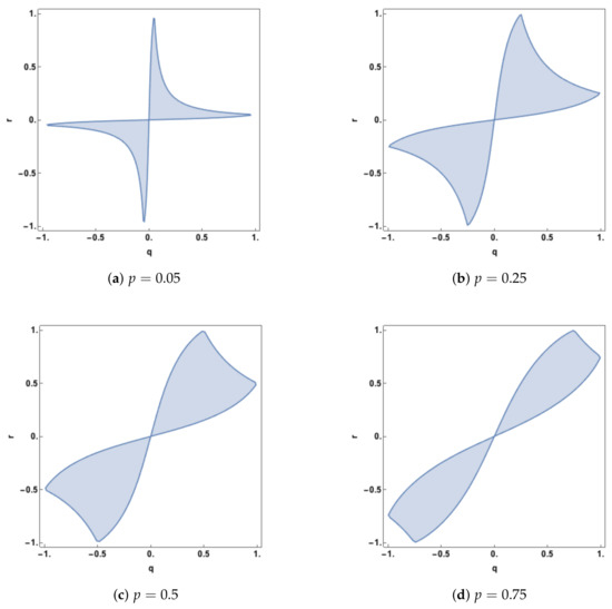 When p is negative, the corresponding plots are identical to those with positive p but rotated counter clockwise by about the point Hence, synergy is present when q and r have the same sign. When q and r have opposite signs, there is also positive synergy for regions defined by