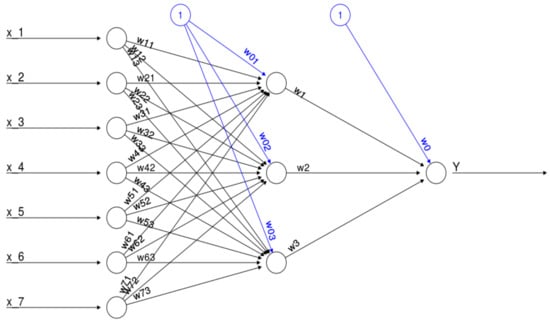 Typically, neurons are organized in layers []. Different layers may perform different kinds of transformations on their inputs. Signals travel from the first (input), to the last (output) layer, possibly after traversing the layers multiple times. Figure 1 gives an example of a neural network (feedforward artificial neural network with initial random weights) which has seven input neurons (equal to the number of independent variables) and one output neuron (equal to the number of target variables) []. In general neural network with a one hidden layer consisting of hidden neurons and input neurons calculates the following function (please compare this equation with Figure 1):