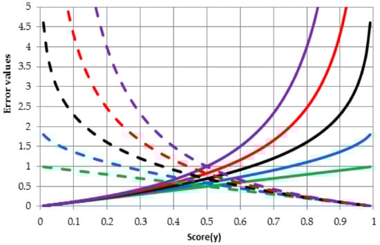 Figure 2 shows the behavior of the error function for different values of parameter and two possible values of target variable i.e., 0 (solid lines) and 1 (dashed lines). Link between colors and values of the parameter is as follows: 0—green, 0.5—blue, 1—black (in this case is equal almost 1 because when formula (4) or (8) becomes the Kullback–Leibler relative entropy), 1.5—red, 2—purple. The solid lines show entropy values for the growing outcome (variable from Equations (8) and (9)) of neural network in case if the true value is 0 (target variable from Equations (8) and (9)). It can be noticed that if the outcome (score from neural network ranging between 0 and 1) tends to 1 then the error function increases, in other words this is undesirable situation for a given case. In contrast, the dashed lines show entropy values for the growing outcome in case if the true value is 1. Once again, entropy values increase when the neural network outcome is inconsistent with the true value. In general, behavior of the error function with -parameter greater than 1 is more non-linear than behavior of error function based on the Shannon entropy ().