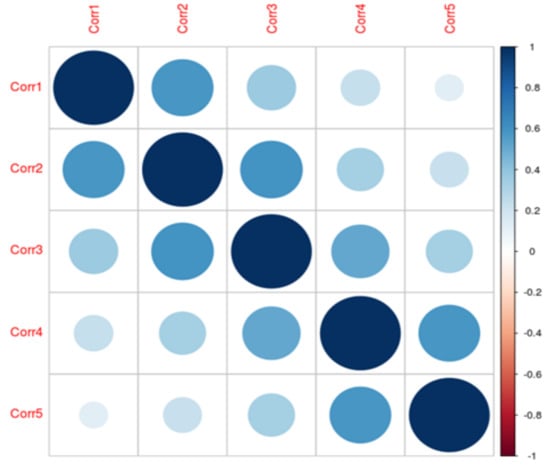 In the second case the independent variables are auto-regressive 1 (AR(1)). While there is no time component to these data, this structure can be used to add independent variables of varying levels of correlation. For instance, if there are 5 independent variables and the correlation parameter is 0.6, then the correlation matrix would be as depicted in the Figure 3.
