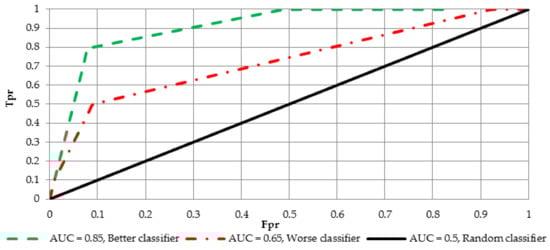 In order to evaluate the model performance, two measures were used: classification accuracy, sensitivity and area under the receiver operating characteristics curve (AUC). As far as binary classification is concerned, the models yield two classes, positive and negative, so there are possible four outcomes, as shown in Table 1 [].