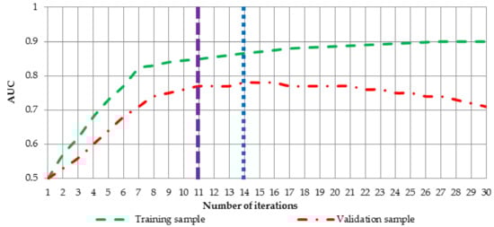 Figure 5 shows AUC values for training (green dashed line) and validation (red dotted-dashed line) sample for ongoing learning process of the neural network. If for instance, weight parameter takes value 0.2, learning process should be terminated after 14 iterations (blue dotted line) and if it takes value 0.7, optimal neural network is achieved after 11 iterations (dashed purple line).