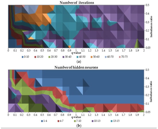 The relation between the number of iterations (a) and the number of hidden neurons (b) in terms of different -values and class imbalance ratio.