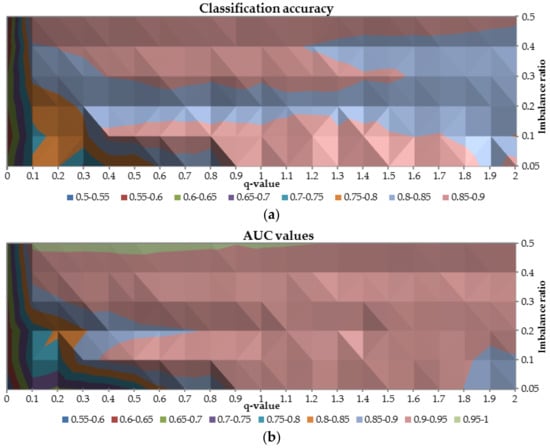 To analyze the overall performance of the ANN trained with -entropy the AUC and classification accuracy were plotted in Figure 7. Combination of these two metrics provides a general diagnosis of the neural networks’ performance. Once again, the worst results are obtained for -value equal to 0 for both considered measures (both measures are not higher than 0.65). Between 0.1 and 0.3 for -value and for class imbalance ratio greater than 0.2, both AUC and classification accuracy are in the range 0.7–0.85, resulted in not acceptable predictive power. It is observed that the highest AUC (0.90) and the highest classification accuracy (0.8) were reached when the -parameter was greater than 0.6.