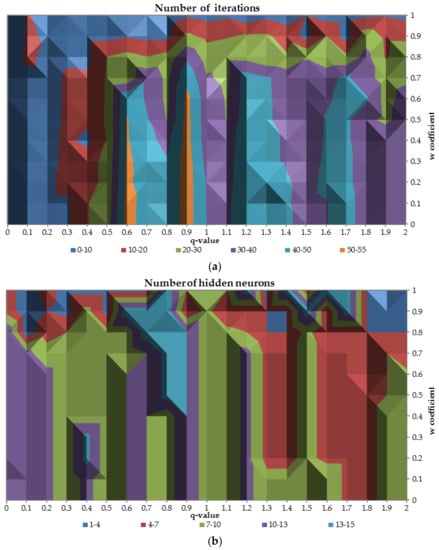 The part (b) of the Figure 8 presents the optimal number of the hidden neurons for the relation between -parameter and parameter. On the part (a) of the figure (for greater than 0.8) there is an area where the number of the hidden neurons divers drastically for different values of coefficient. For the -values between 0 and 1.3 optimal number of the hidden neurons are in the range 7–13 and for greater values of the -parameter number of the hidden neurons slightly decrease to the range 4–10, while parameter is less than 0.8.