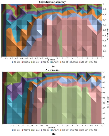 In order to analyze the overall performance of neural networks built for different values of the -parameter, Figure 9 with AUC and classification accuracy was prepared. The relation between classification accuracy and AUC on the test sample in terms of different values of the -parameter and the coefficient is very similar. As shown in the figure the relation is diagonal from the left upper corner to the right lower corner. The best performance neural network achieves when is greater than 0.8 and is less than 0.7. When -parameter decreases and coefficient increases the overall performance deteriorates up to 0.5 for both measures. Additionally, it was observed that with q = 1 the performance of the network was satisfactory, however, there were some areas of its enhanced performance due to application of q measure. For instance, when the q was equal to 1.2 and the w was lower than 0.5 then the classification accuracy was reaching 0.95.