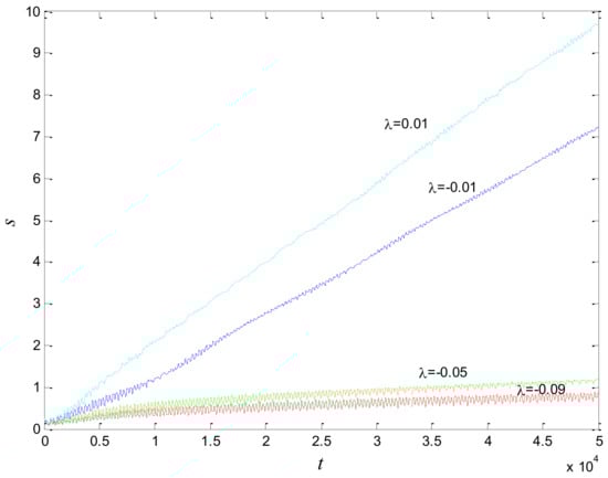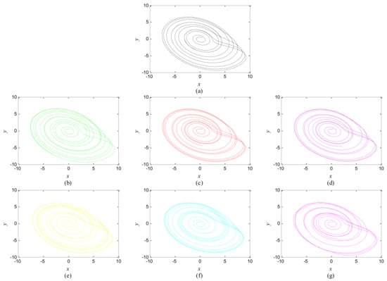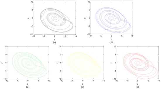 where are the eigenvalues of the system (A4). To satisfy the condition , and are set to −1, −1, −1, respectively. Then, the error system (A4) is stable and the two systems can synchronize.