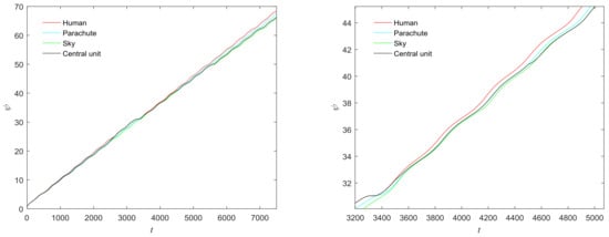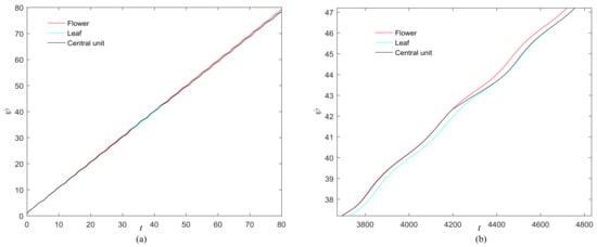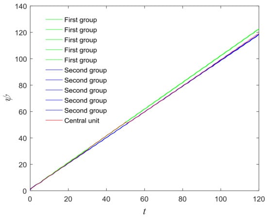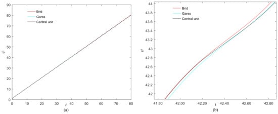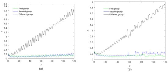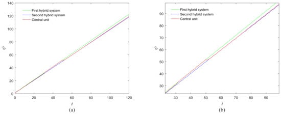 The phase growth of the central unit with two hybrid systems is shown in Figure 2a. The phase growth of the first hybrid system and the central system are the same from t = 30 to t = 50. This indicates that the two systems are in phase synchronization in this time span. The red line in Figure 2a stands for the phase of the central unit. The phase jumps at t = 30 and t = 50, as shown in Figure 2b. This means the phase of the central unit has a transition. After t = 80, the control unit does not control the second group of neurons and the phase growth of the central unit differs from the second group of neurons. Figure 3 shows that the central unit achieves phase synchronization with randomly selected oscillators in each group. The phase standard deviations of oscillators representing the same object are small, as shown in Figure 4. This also indicates that the oscillators representing the same object are synchronized. Figure 5 depicts the attractor of each of the three systems. Figure 4a,b shows that the phase standard deviations representing the same group obtained by our model changes are smaller than that obtained by the model proposed in []. It shows that the consistency of the oscillators in the same group is better. Comparing Figure 5a,b, it can be seen that the phase of the first hybrid system changes more quickly than the second one does and the central unit has an obvious transition. Thus, we have implemented phase synchronization between the single central unit and the network composed of coupled oscillators.