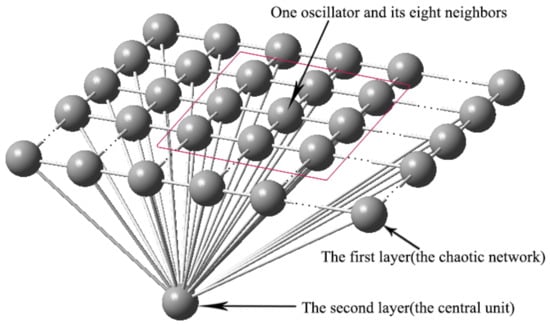 In this section, the visual shift model is described by graph and text. The proposed model consists of two-layer Rössler oscillators and is shown in Figure 6. In the first layer, every oscillator couples with eight neighbors, except oscillators on the boundary. The mathematical model of the network is described by Equation (7). The main function of the first layer is to represent the formation of visual information. The structure of this layer is the same as the oscillator network in [] and the way of connecting the network can encode topology and can separate different objects in the image. The number of oscillators is selected according to the size of the image. The second layer, composed of a central neuron oscillator, acts as the central neuron. The central neuron is coupled with different groups of neurons in the first layer at different times. The different groups of neurons represent different objects. The central neuron synchronizes with different groups of neurons by active control methods and realizes the communication with the imaging neurons. The model is described by Equations (7) and (8):