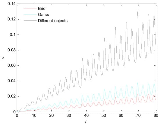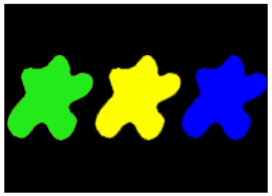 The first artificial image has three objects, as shown in Figure 8. To improve computing speed, the image is resized to 210 × 151 pixels. The oscillators representing the same object achieve phase synchronization due to the coupling strength and homologous frequency. On the other hand, the neurons representing different objects are desynchronized. Figure 9 shows the differences in phase among oscillators representing different objects from different perspectives. In the (i, j) axis, a random selection of oscillators is shown corresponding to the blue object, background, yellow object, the background and the green object one after the other from right to left, respectively. The oscillators representing yellow objects have the fastest phase growth, closely followed by the oscillators representing green objects, then oscillators representing blue objects and finally oscillators representing the background. The attractors of the hybrid systems corresponding to different objects are shown in Figure 10. The moving trajectories of oscillators for different objects are distinctive. In the experiment, the central unit and the first layer oscillators begin to oscillate at the same time. When the central unit finds the most salient object whose phase velocity is the fastest, it will couple with these oscillators and achieve synchronization with them by the active control method. The duration of synchronization is attention span, denoted by Ft (in this experiment Ft = 10). When the fixation time is over, attention will shift to the second salient object. The shift strategies are the same until the attention scans all objects in the scene. The attention shift process is shown as in Figure 11. When t = 20, the central neuron will start phase synchronization with the oscillators corresponding to the yellow object and will then maintain synchronization with them for Ft. At t = 30.01, the central unit will couple with the neurons representing the green object. During the entire process, the phase of the central neuron transitions four times. The control unit’s attractor is shown as in Figure 9e and the transition is obvious. The phase growth between different objects is distinctive. The phase standard deviation of each object is shown in Figure 12. The standard deviation is low between the same objects and high between different objects. In Figure 9, Figure 10 and Figure 11, it can be seen that for more salient objects, the phase growth is faster. This result of this experiment is consistent with the conclusion in []. It suggests that the fractional-order network layer can be used for image segmentation.