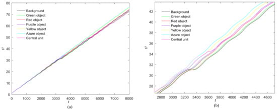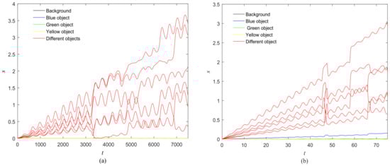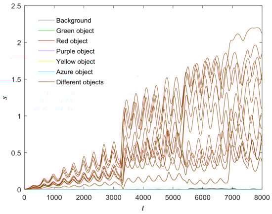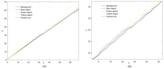The proposed model can also be used in scenes with more objects, such as those shown in Figure 13, Figure 14, Figure 15, Figure 16 and Figure 17. There are six different phase types in Figure 14: yellow object, purple object, green object, azure object, red object and background. The attractors corresponding to different-colored objects are different. The central unit, represented by the pink line, transitions six times. The central unit’s attractor also reflects the phase transitions. The standard deviation is low between the same objects and high between different objects. The results confirm that the proposed model is reasonable.