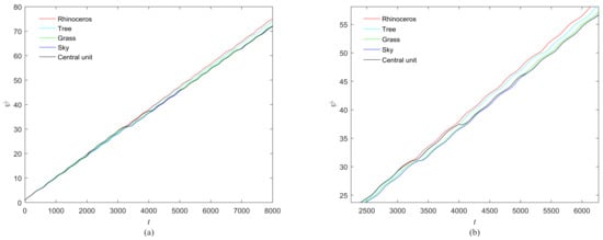 Furthermore, we employ the natural images to test the proposed model. The natural images are shown in Figure 18 and Figure 19 and the experimental results are shown in Figure 20, Figure 21, Figure 22, Figure 23, Figure 24, Figure 25, Figure 26 and Figure 27. It can be seen that the phase growth is distinct for different objects. The control unit is also synchronized with the “attention object” during the control time. More detailed views are included as Figure 22b and Figure 26b, in which the phase transition is obvious. Note in Figure 23 and Figure 27 that the phase standard deviation between different objects is relatively small. This is because the contrasts between pixels derived from Equation (9) are small. The small contrasts lead to small phase differences between oscillators representing different objects. However, the central neuron can still synchronize with different oscillators at different times. The phase standard deviations representing the different objects obtained by our model grows more rapidly than that obtained by the model proposed in [], as shown in Figure 23b Thus, the proposed model is also effective for visual selection and shifting in natural images.