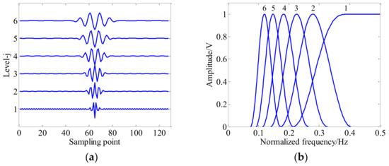 Wavelet waveform and frequency responses with fixed Q-factor and different j scales (e.g., Q = 2.5, j = 1, 2, 3, 4, 5, 6). (a) Wavelet time domain waveform; and (b) frequency responses.