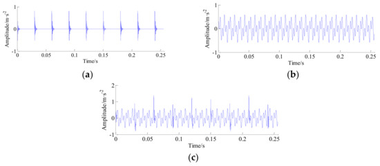The simulated signal. (a) The simulated periodic impulses; (b) the simulated high-frequency signal; and (c) the simulated synthetic signal.