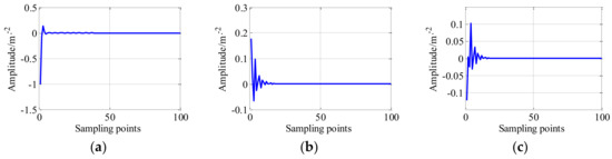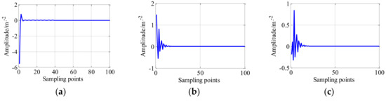 Before reconstruction, the dictionary atom is designed for dictionary learning, similar, according to the range of amplitude of LRC generated by TQWT-MCA is [−0.1, 0.1], the parameters of the impulse-step impact dictionary atom are set as follows: the system damping constant τ is 0.001, peak value ratio a is 0.3, the system natural frequency fn = 10,000 Hz, the impulse-like response happened u is 0.005, the rotor speed rotation frequency fr is 800 rpm, and adjusting parameters and . The time-domain waveforms of the impulse-like atom, step-like impact atom, impulse-step-like impact atom are shown in Figure 12. As shown in Figure 12c, the range of the amplitude of the dictionary atom is [−0.1, 0.1].