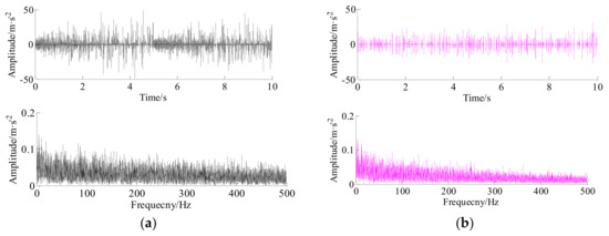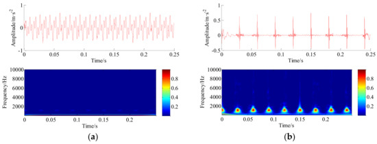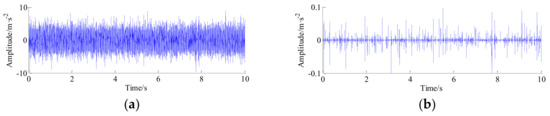 Furthermore, time-domain signal is processed by the TQWT-MCA method. The decomposition parameters of the TQWT-MCA method are illustrated in Table 4. The decomposition results related to the high-resonance and low-resonance behavior are shown in Figure 11a,b, respectively. As can be seen from the Figure 11b, the periodic impulses related to the fault information can be peeled by the TQWT-MCA method from the raw vibration signal one by one, meanwhile, the noise has been also effectively suppressed.