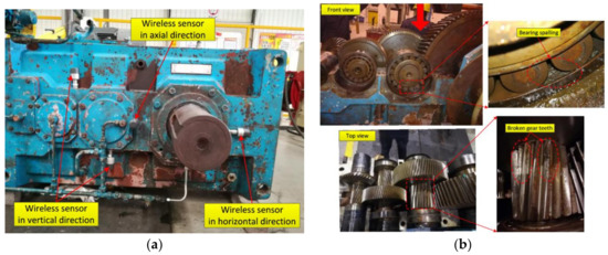 Experimental setup of gearbox with multi-fault. (a) Before dismantling; and (b) after dismantling.