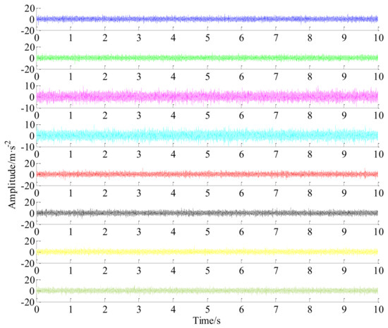 In this experiment, a series of acceleration sensors, i.e., WD-ACWL500 wireless sensors (it obeys Zigbee wireless communication protocol), were used for signal acquisition. The vibration data were recorded from bearing bracket (see Figure 9a) of the shaft-IV using an eight-channel NI sampling system (the acquisition equipment was omitted in Figure 9), the raw vibration signal (51,200 sampling points are selected, i.e., 10 s) from channel #1 to channel #8 are displayed in Figure 10. The top row is channel 1#, the second row is channel #2 and the bottom is channel #8 accordingly. To clearly examine the data recovery quality, channel #1 and channel #8 are randomly chosen as the research objects.
