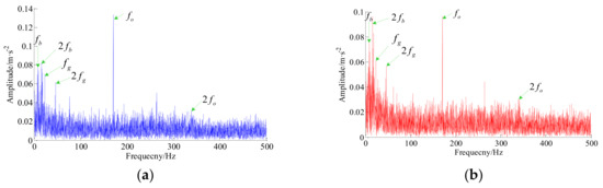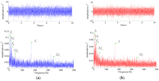 Additionally, we continue to analyze the raw vibration signal from channel #8. The waveform of the original signal and its envelope spectrum, the reconstructed signal generated by the proposed algorithm and its envelope spectrum are shown in Figure 17a,b, respectively. Apparently, the clear bearing outer race fault frequency at 170.7 Hz and its harmonics at 341.3 Hz, the bearing ball fault frequency at 7.344 Hz and its harmonics at 15.0 Hz, and the gear fault frequency at 23.36 Hz and its harmonics at 47.42 Hz are detected in envelope spectrum.