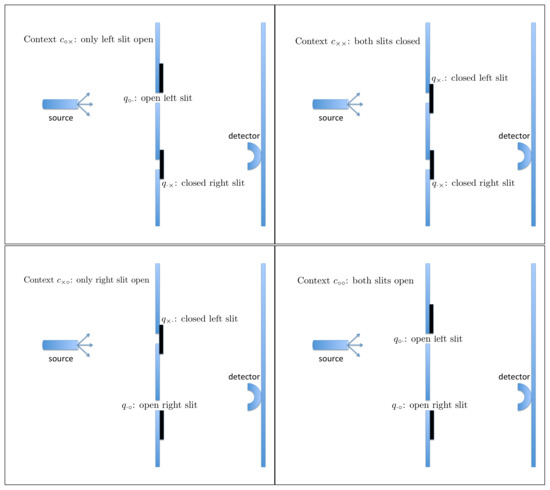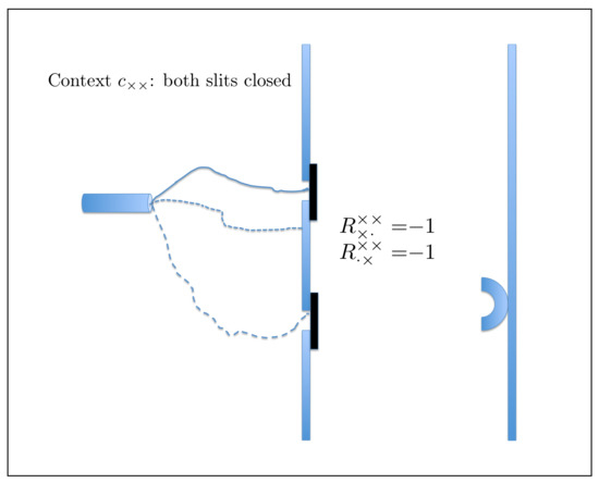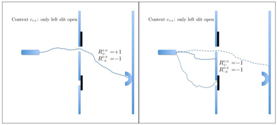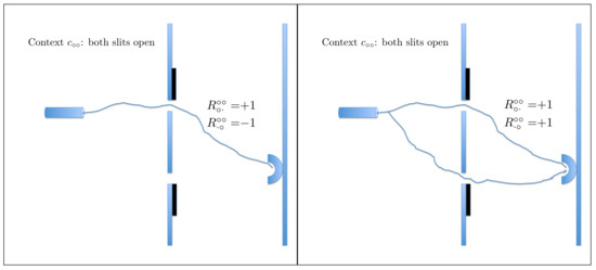 Here, q denotes a particular slit, left or right, and whether it is open or closed, whereas c denotes the variable part of the experimental set-up: which of the two slits is open and which is closed. The answer to the question Q1 is Yes ( if the conjunction of the following two events occurs: the particle passed through q, and the particle hit the detector. If this has not happened, . For instance, if (the left slit is open, the right one is closed) and (indicating the closed right slit), then means that the particle passes through the closed right slit and hits the detector. The probability of this happening is, of course, zero. It is in fact the only physical assumption used in our analysis: that it is impossible for a particle to pass through a closed slit. This can be complemented by the statement (we choose not to consider it as a separate assumption) that it is meaningful to speak of a particle passing or not passing through an open slit. We assume nothing else about possible trajectories, and do not even commit to any specific meaning of the term “trajectory” (the graphical illustrations in Figure 2, Figure 3 and Figure 4 being merely visual aids). We allow the particle to pass through more than one slit at a time, any number of times and in any succession or simultaneously, before hitting the detector or missing it.