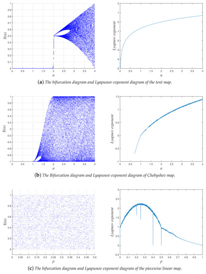The parameter p can serve as a key, as the PWLCM system is chaotic and has few periodic windows in its bifurcation diagram in the whole range of the parameter [43]. For a uniform invariant distribution and excellent ergodicity, the PWLCM chaotic map is employed in the proposed algorithm with a given initial value and control parameter p. The bifurcation diagram and Lyapunov Exponent diagram of PWLCM are shown in Figure 1c.