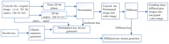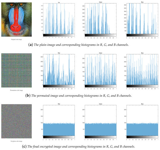 With the dramatic development of Internet technology, a great deal of sensitive information conveyed by digital images has been transmitted over public networks. The security problems of image transmission have become increasingly serious, especially for those related to confidential, medical, military, or commercial affairs. However, since digital images have some inherent characteristics (e.g., high redundancy, large data capacity, and strong correlation between adjacent pixels), the traditional block ciphers like Data Encryption Standard (DES), International Data Encryption Algorithm (IDEA), Advanced Encryption Standard (AES), RSA (Rivest–Shamir–Adleman), etc. do not have high performance. In recent years, chaotic maps have been used in image encryption, which have benefited from their excellent properties, such as strong ergodicity as well as sensitivity to initial conditions and control parameters. As early as 1989, Matthew suggested the use of logistic maps to generate pseudo-random numbers, which can be used to encrypt messages [1]. In 1998, a new symmetric block encryption scheme proposed by Fridrich [2] drew a great deal of attention. The architecture is similar to the one Shannon introduced in [3], which includes a pixel-level permutation-diffusion structure. In the permutation stage, the pixel position is scrambled to disturb the strong correlation between two adjacent pixels of the original image, but the pixel’s statistical property is not changed. Later, in the diffusion stage, the pixel values are modified to achieve a uniform distribution of pixel values [4,5,6,7,8,9]. For instance, Gao et al. used a total shuffling matrix to change the image pixel positions in the permutation stage, and then a hyper-chaotic system is used to modify the pixel values of the shuffled-image to obtain the cipher-image [4]. In [5], four values obtained from the logistic map are used to disorder four equal sub-images divided from the plain-image, and then a total shuffling matrix is used to shuffle the position of the pixels in the whole plain-image. Finally, the four sub-images are diffused simultaneously in parallel. More recently, chaotic systems have been used to encrypt images in specific fields. For example, Abundiz-Pérez et al. proposed a high-security and fast fingerprint image encryption scheme based on hyperchaotic Rössler maps [6]. In [8], a novel symmetric encryption algorithm based on confusion-diffusion architecture is provided and used to encrypt clinical information. All simulation results of the encryption system show its effectiveness, security, and robustness. Compared with gray-level images, color images can provide more information, so color image encryption attracts increasing attention. In recent years, plenty of chaos-based color image encryption algorithms have been proposed [10,11,12,13,14,15,16,17]. In order to make the RGB components of a color image affect each other and obtain high security, Wang et al. [10] used a chaotic system to encrypt these three components at the same time. In [12], Wang et al. transformed the R, G, and B components of a color plain-image into a matrix. When the matrix is passed through a permutation operation using zigzag path scrambling and a substitution process, the ciphered color image is obtained. Later, in 2017, Huang et al. [15] used Logistic map to diffuse the color image, then the RGB components are scrambled by Logistic mapping. Secondly, double random-phase encoding is used to encrypt the three scrambled sub-images into one encrypted image.