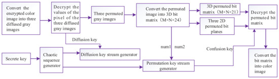 The decryption procedure is the inverse process of encryption. The flowchart of the decryption process is shown in Figure 5. The diffusion equation used in decryption is given as