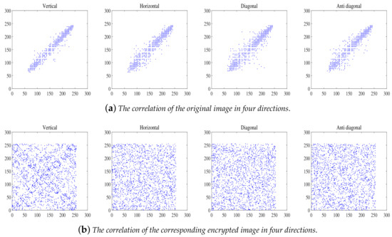 The correlation coefficient of the pixels of the plain-image is always high because the adjacent pixels in the plain-image have a high correlation which can be used by attackers. So, the correlation coefficients of the pixels should be significantly reduced after the plain-image is encrypted. According to Equation (26), we calculate the correlation coefficients of the four directions, including the vertical, horizontal, diagonal, and anti-diagonal directions.