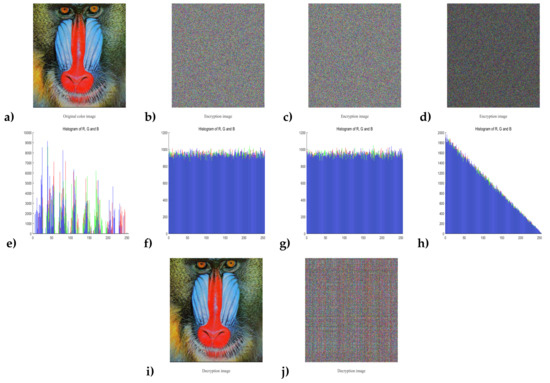 Another key sensitivity test is shown in Figure 8. Firstly, a key set was chosen from the security key space denoted as . To evaluate the sensitivity of , a slight change is added into the secret key while the others were unchanged. Then the key denoted as could be obtained. After that, we used and to encrypt the same original image as shown in Figure 8a to obtain two corresponding cipher-images denoted as and , shown in Figure 8b,c. The image of pixel-to-pixel difference is shown in Figure 8d, and its histogram is shown in Figure 8h, which can prove that a tiny change in the security key will result in a significant change in cipher-image. Finally, we used to decrypt the cipher images and individually, and the decryption results are shown in Figure 8i,j. As can be seen, only the correct key can completely reconstruct the original image. Thus, the proposed algorithm has high key sensitivity.