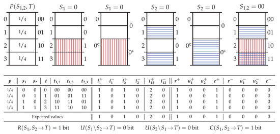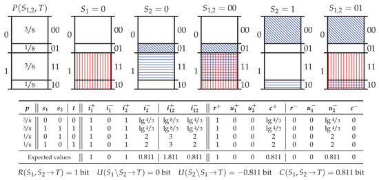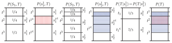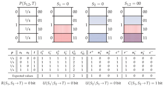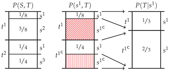 By definition, the pointwise information provided by s about t is associated with a change from the prior to the posterior . As we explored from first principles in Finn and Lizier [39], this change is a consequence of the exclusion of probability mass in the target distribution induced by the occurrence of the event s and inferred via the joint distribution . To be specific, when the event s occurs, one knows that the complementary event did not occur. Hence one can exclude the probability mass in the joint distribution associated with the complementary event, i.e., exclude , leaving just the probability mass remaining. The new target distribution is evaluated by normalising this remaining probability mass. In [39] we introduced probability mass diagrams in order to visually explore the exclusion process. Figure 1 provides an example of such a diagram. Clearly, this process is merely a description of the definition of conditional probability. Nevertheless, we content that by viewing the change from the prior to the posterior in this way—by focusing explicitly on the exclusions rather than the resultant conditional probability—the vague intuition that redundancy corresponds to overlapping information becomes more apparent. This point will elaborated upon in Section 3.3. However, in order to do so, we need to first discuss the two distinct types of probability mass exclusion (which we do in Section 3.1) and then relate these to information-theoretic quantities (which we do in Section 3.2).