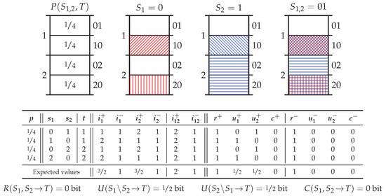Figure A2 shows the decomposition of the probability distribution unique (Unq). Note that this probability distribution corresponds to RdnErr where the error probability , and hence the similarity in the resultant distributions. The results may initially seem unusual, that the predictor is not uniquely informative since = 0 bit as one might intuitively expect. Rather it is deemed to be redundantly informative = 1 bit with the predictor which is also uniquely misinformative = −1 bit. This is because both and provide = 1 bit of specificity; however the information provided by is unique in that the 1 bit provided is not “useful” ([42], p. 21) and hence = 1 bit while = 1 bit. Finally, the complementary information = 1 bit is required by the decomposition in order to balance this 1 bit of unique ambiguity. The results in this example partly explain our preference for term complementary information as opposed to synergistic information—while = 1 bit is readily explainable, it would be dubious to refer to this as synergy given that enables perfect predictions of T without any knowledge of .
