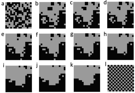 The first component of this evaluation uses neutral models to produce 12 different landscape configurations for a landscape of 256 cells in 16 × 16 dimensionality, with two cover types, each with 50% area. I used QRULE [13] to produce a simple random map (Figure 1a) and multi-fractal maps with H parameter (which controls the degree of aggregation), ranging from 0.1 (highly fragmented) to 1 (highly aggregated), at 0.1 an interval of 0.1 H unit (Figure 1b–k), with a constant random number seed. Finally, to produce a highly dispersed pattern, I generated a perfect checkerboard (Figure 1l).