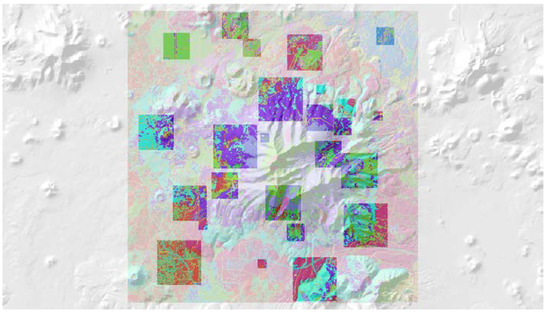 Location and pattern of the 25 sample landscapes in the San Francisco Peaks region of Northern Arizona. The extent of the 20 × 20 sample landscape is shown in semitransparent background overlaid on a hillshade of topography. The individual sample landscapes are shown with random colormap corresponding to each class in the cover type-seral stage classification.