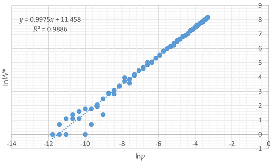 There is a very strong relationship between lnW* (logarithm of the number of instances of a given total edge length out of 100,000 permutations of the 16 × 16 landscape lattice), and lnp (relative Boltzmann entropy) (Figure 4). Specifically, lnW* and lnp are linearly related, with a slope of 1, and an intercept of 11.47 (Figure 4, R-squared 0.989), a very tight 1:1 linear relationship between the formal Boltzmann entropy lnW* and the relativistic form of Boltzmann entropy lnp.