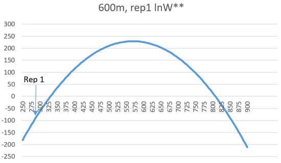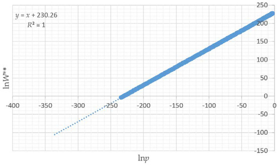 Given the intractably large number of possible configurations that a lattice of 256 cells with 50% area in each of two classes can take (256!/(128! × 128!; [11]), it is not possible to compute the exact number of true microstates. Given that we cannot fit the canonical forms of the relationships between lnp and lnW, we therefore cannot estimate the true Boltzmann entropy (lnW) for each observed level of total edge length expressed in the 12 test landscapes. However, we can be confident that the linear and logarithmic relationships between lnp and lnW will be consistent. I verified this by computing the expected number of microstates (W**) with each amount of total edge length among 10 × 10100 permutations of the 256 cell lattice, using the parametric normal probability density function, and confirmed that the slope is constant at 1, and only the intercept changes (Figure 5). Therefore, the linear relationship between lnp and lnW gives us a means to compute the relative Boltzmann entropy for each test landscape. Specifically, the ratios of the lnp values for the different test landscapes provide a measure of the relative difference in the Boltzmann configurational entropies.