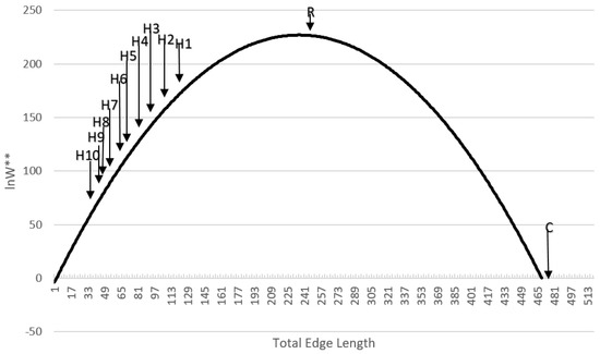 Plotting the lnW** values against total edge length across the full range of values in the normal probability distribution function shows that the shape of the entropy-edge length relationship is parabolic (Figure 6). This follows from the mathematical facts that a log transformation of a Gaussian curve is a parabola, the frequency of total edge length in the permuted distribution of landscape lattices is normally distributed, and entropy is defined as the logarithm of the frequency of microstates (unique configurations) in a macrostate (amount of total edge length).