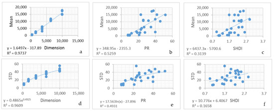 Scatter plots of the relationships between landscape dimensionality, patch richness and Shannon diversity and the mean (a–c) and standard devation (d–f) of the normal distribution of permuted total edge lengths across the 25 sample landscapes in the San Francisco Peaks region.