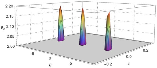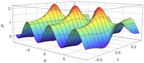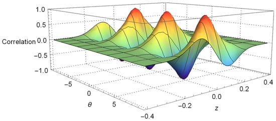 We have plotted Equation (12) on Figure 1, where we take as a constant; we set and in a very similar way as is carried out in [,]. This figure allows us to see the oscillatory behavior of the correlation function with variables z and predicted in Equation (12). Furthermore, there, we can notice how the oscillations in z decay very fast when its values are increased, until this effect is hardly appreciated. In the same way, the negativity of the Wigner function is also perceived, which is commonly associated with some kind of nonclassical behavior, although some care must be taken when using this interpretation of the negativity because it involves the spin variable also. This issue is associated with the definition of the Wigner function for finite dimensional Hilbert space [,,,].