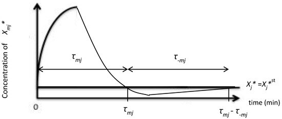 A common time course of the j-th step, showing fold changes during phosphorylation. The vertical axis denotes the concentration of signaling active molecule. The horizontal axis denotes the duration (min or time unit) of the j-th step. τmj and τ−mj represent the duration of the j-th step and the −j-th step, respectively. The line Xj* = Xj*st denotes the concentration of Xj* at the steady state.
