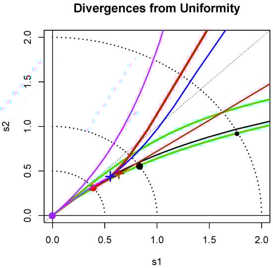 The lower green line near the Pareto black curve gives the loci of root-divergences from uniformity of the Tukey() with , while the upper green curve corresponds to . It is known that the Tukey() distributions, with , are good approximations to Student’s t-distributions for provided is chosen properly. The same is true for their corresponding pdQs ([], Section 3.2). For example, the pdQof with degrees of freedom is well approximated by the choice Its location is marked by the small black disk in Figure 1; it is of distance 2 from uniformity. The generalized Tukey distributions of [] with two shape parameters also fill a large funnel shaped region (not marked on the map) emanating from the origin and just including the region bounded by the green curves of the Tukey symmetric distributions.