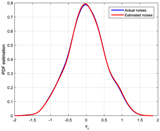 PDF estimation of the actual and estimated bimodal distribution noises.