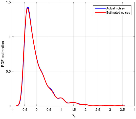 Noise estimated values can be obtained by the improved EDA algorithm. There are many ways to describe the estimation effect, such as histogram and kernel density estimation. Since PDF is used in the MEC-based CPA index, the kernel density estimation method for actual noises and estimated noises will be used to show the estimation effect. The corresponding PDF estimation results of actual noises and estimated noises are shown in Figure 4, Figure 5 and Figure 6.