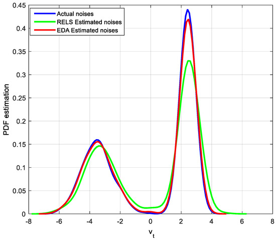 Parameter estimation results show that both methods seem to be available as system parameter estimates. However, the noise and its estimated distribution shown in Figure 7 indicate that the RELS method is ineffective in estimating the noise of the bimodal distribution.