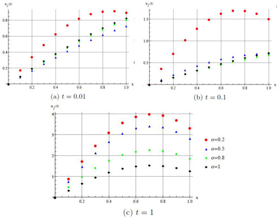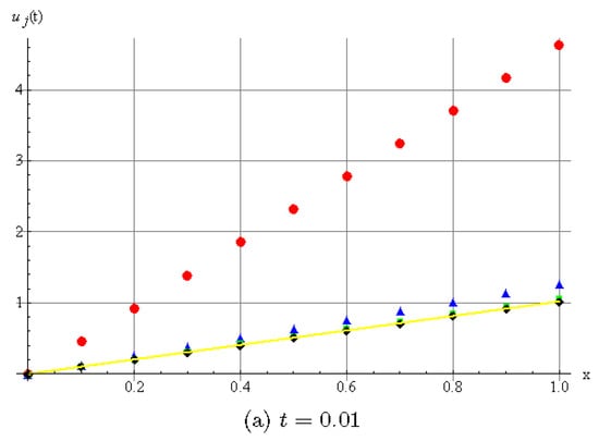 Numerical illustration of approximation solution u(x,t) by DHAM. (a) For t = 0.01; (b) For t = 0.1; (c) For t = 1.